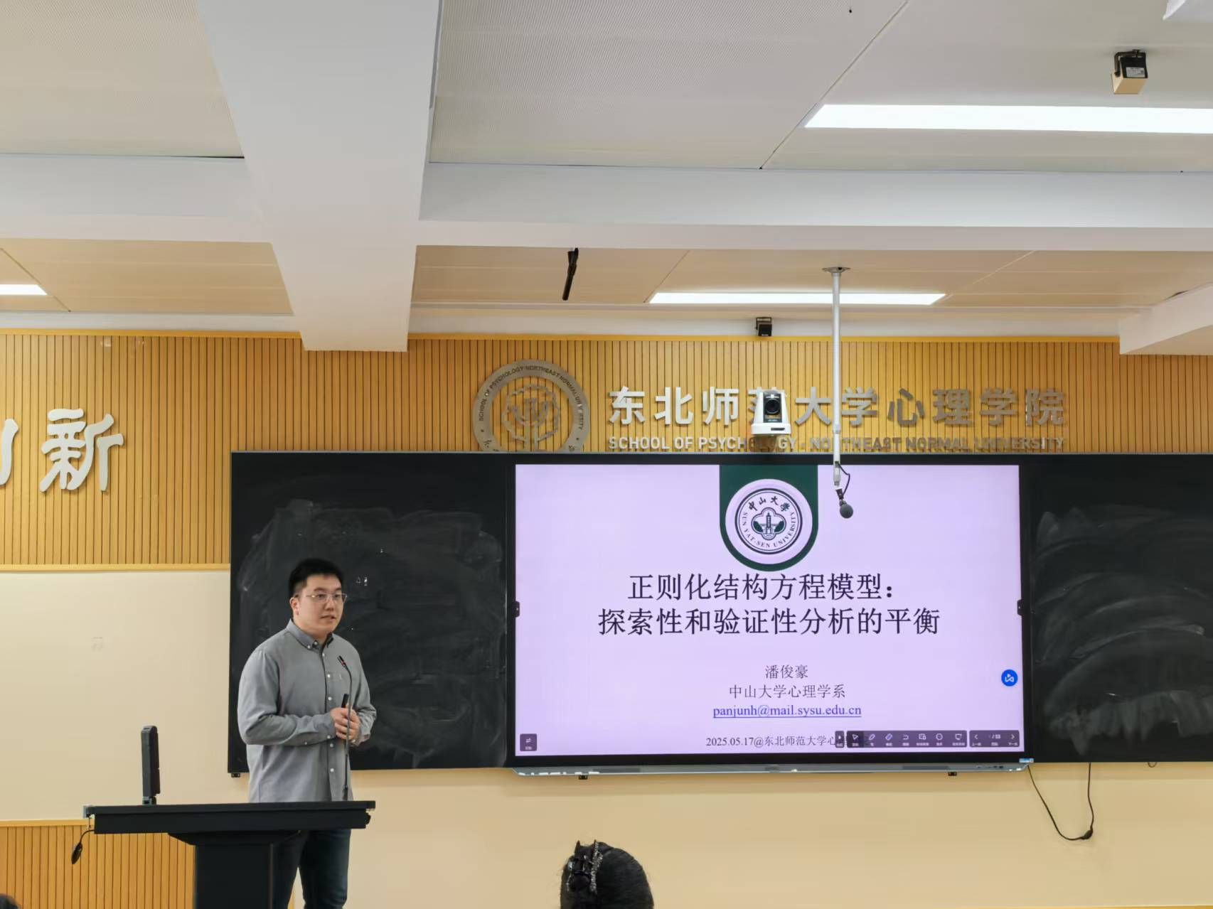 中山大学潘俊豪教授以“正则化结构方程模型:探索性和验证性分析的平衡”为题,系统介绍结构方程模型中的正则化方法。讲座从频率学派与贝叶斯学派的角度出发,提出了兼顾模型解释力与稳定性的建模策略,为心理学定量研究提供了方法论突破。